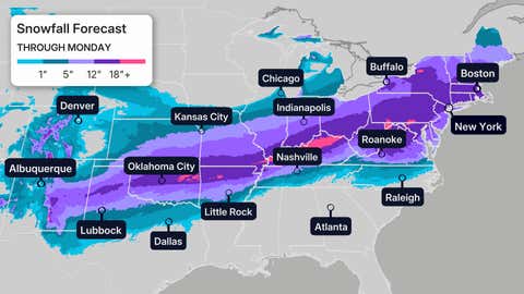 This map shows where heavy snow is most possible during Winter Storm Fern from through Monday. Areas in the purple and pink contours have the best chances of significant accumulating snow, possibly mixed with sleet.